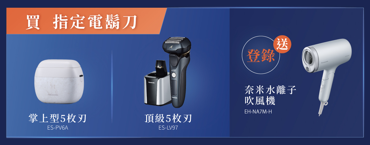 買指定五枚刃電鬍刀登錄送奈米水離子吹風機EH-NA7M