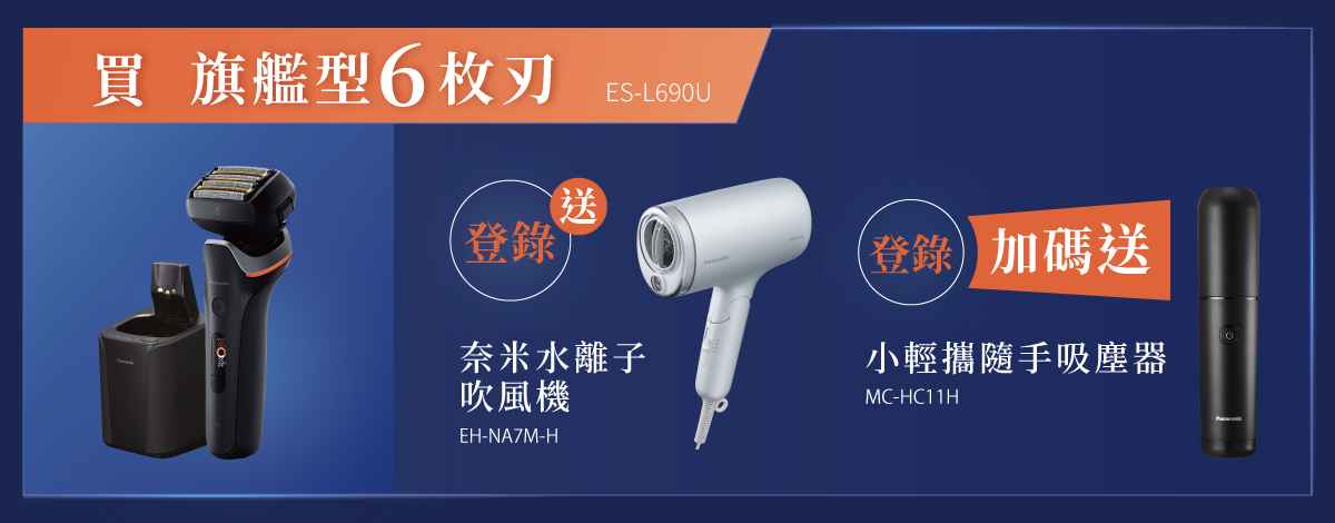 買旗艦型6枚刃電鬍刀登錄送奈米水離子吹風機EH-NA7M