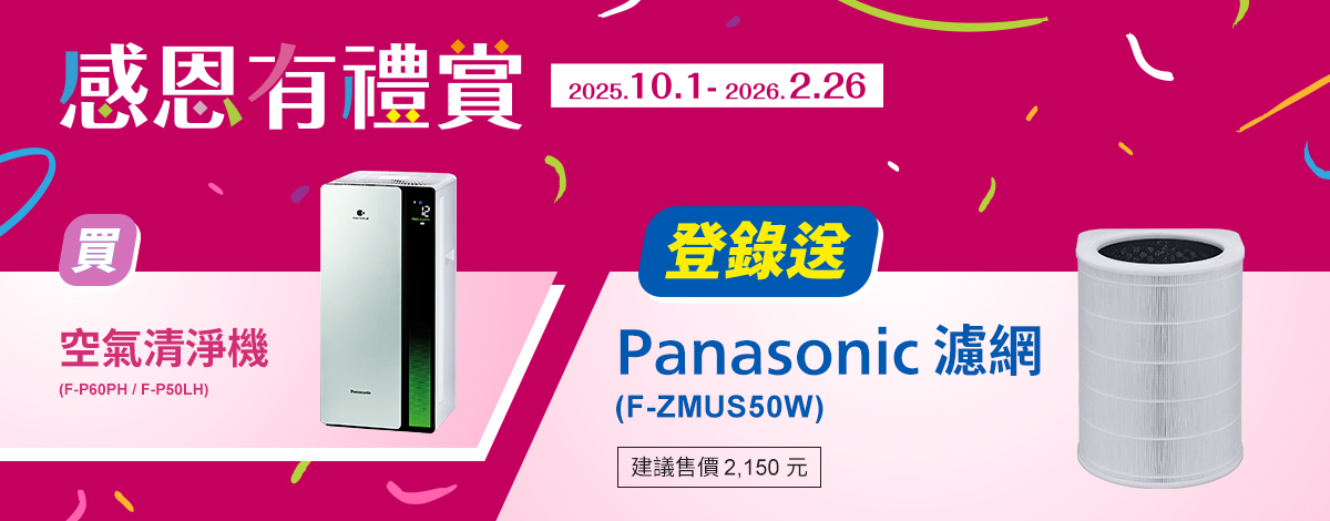 買空氣清淨機P50LH/P60PH登錄送Panasonic濾網