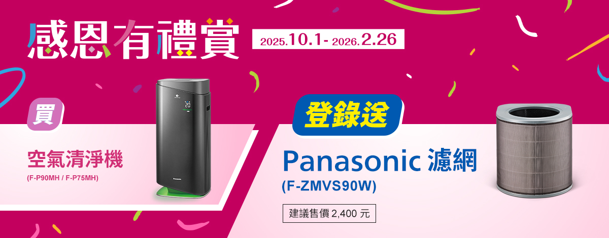 買空氣清淨機P75MH/75MHC/90MH登錄送Panasonic濾網