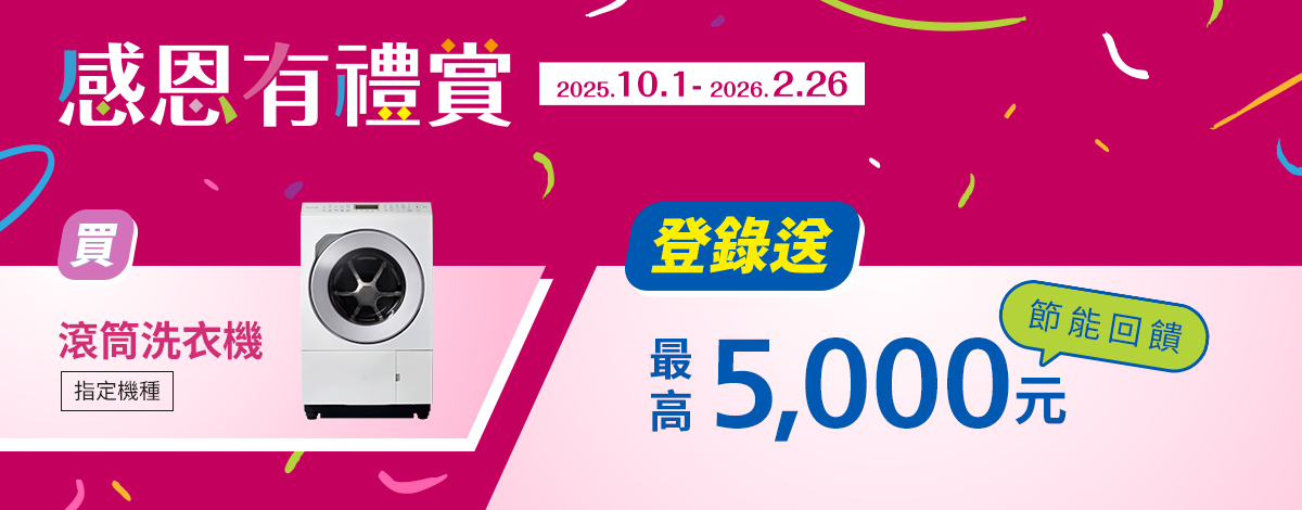 買滾筒洗衣機指定機種最高回饋5000元