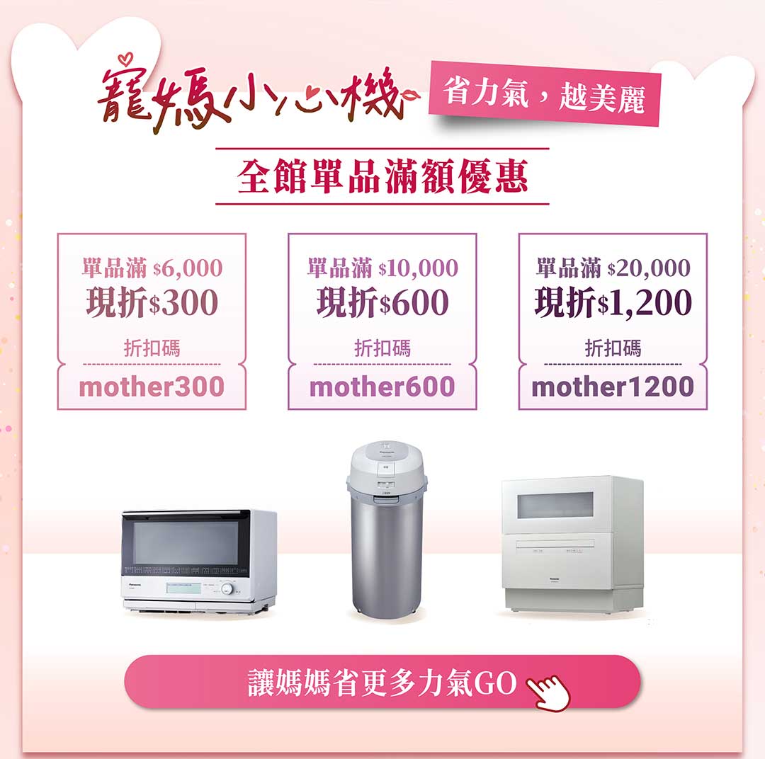 ※折扣碼【mother300】/【mother600】/【mother1200】適用此商城主要商品之訂單,如生活小家電、廚房家電等。