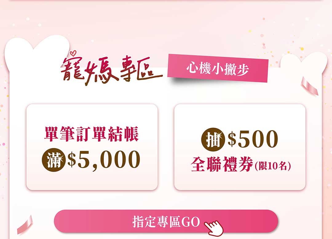 活動期間購買「寵媽專區」內單筆訂單滿5000元,加碼抽500元全聯禮券(限10名)。