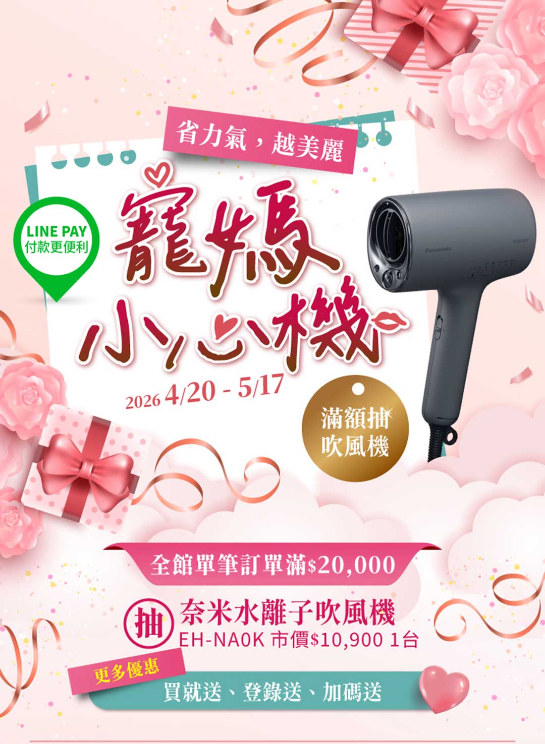 全館單筆訂單滿20,000元,即可抽奈米水離子吹風機EH-NA0K(1名)