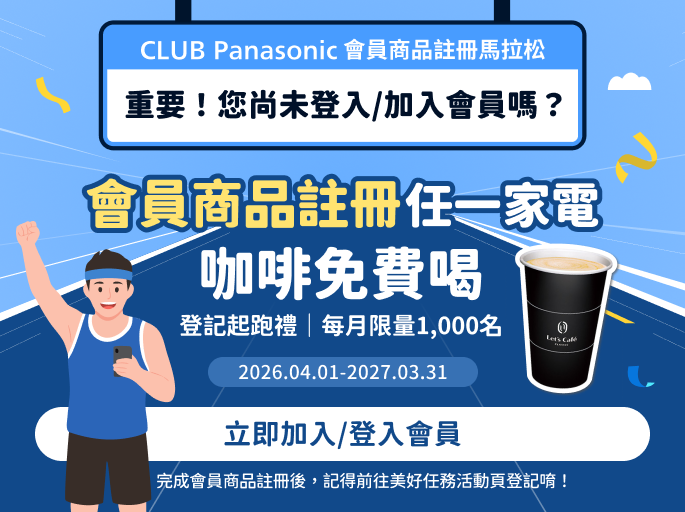 請盡速上網(http://club.panasonic.tw)免費加入CLUB Panasonic 會員俱樂部,並完成商品註冊者,就享有上述免費延長保證,還有會員專屬好康優惠等著您!